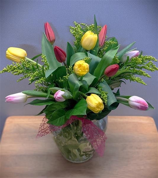 A vibrant mix of seasonal tulips presented in stylish glass vase.