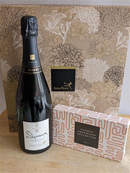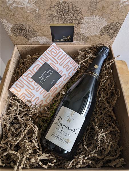 This gift set contains a 75cl bottle of Devaux Grande Reserve Champagne and a scrummy selection of filled chocolates - 99g Single Layer Box