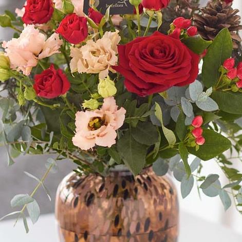 A gorgeous amber-like flecked vase filled with fresh flowers in classic Christmas colours.