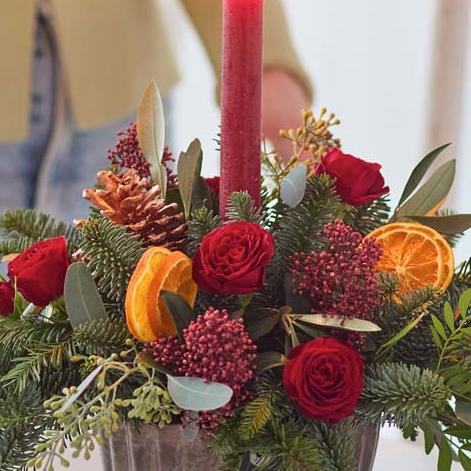 A gorgeous selected of fresh festive flowers, arranged around a red candle, in a dark copper coloured ceramic bowl.