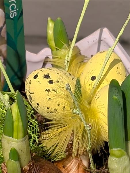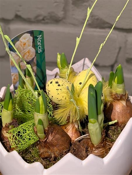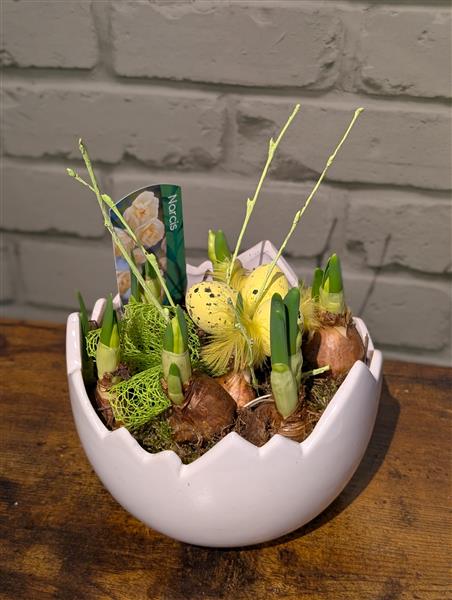 These Bridal Crown Narcissi are arranged into this ceramic cracked egg style planter with cute Easter themed decoration.