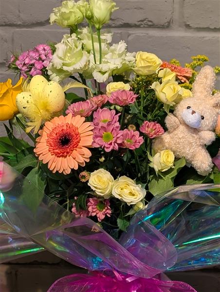 A lovely gift wrapped glass vase filled, filled with a mixed selection of fresh flowers and cute Easter theme decorations.