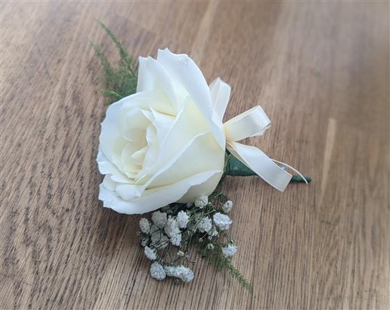 An elegant rose with delicate foliage and accent ribbon bow with pretty Gypsophila. Supplied ready to wear with a fixing pin.