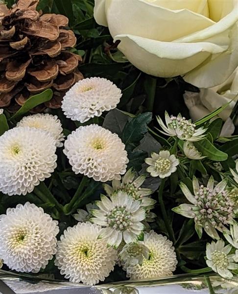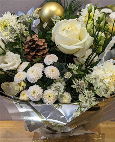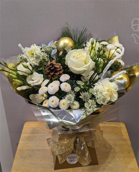 Embrace the glitz and glamour of Christmas with this stunning selection of the finest flowers in classy neutral tones accessorized with gold and silver painted foliage & accessories.