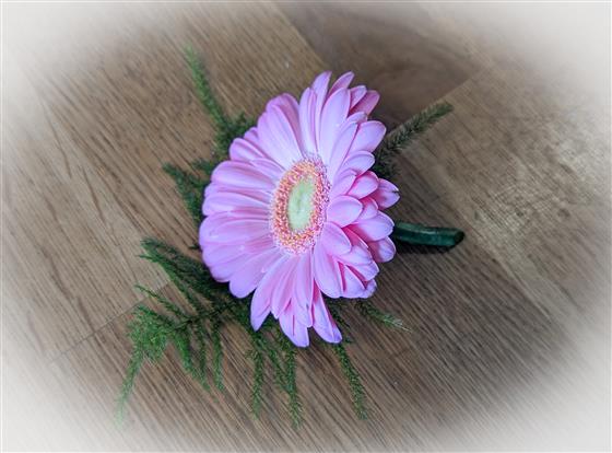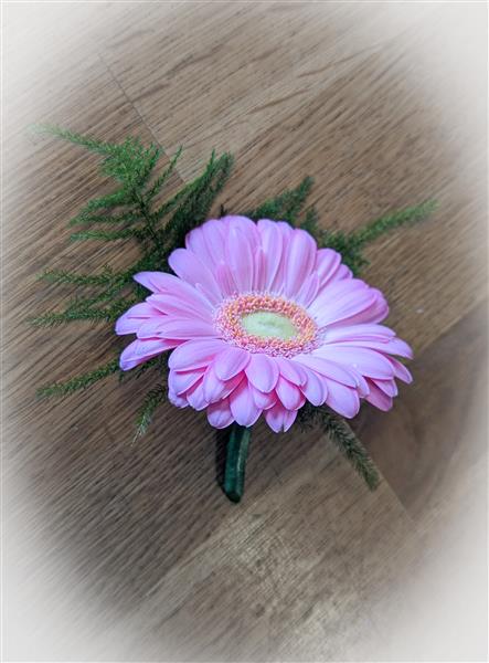 A beautiful Gerbera Daisy, available in many colours, with a subtle foliage accent supplied ready to wear with a fixing pin.