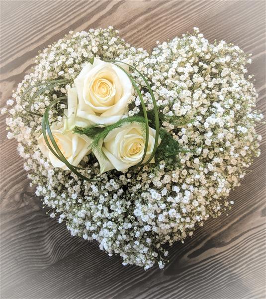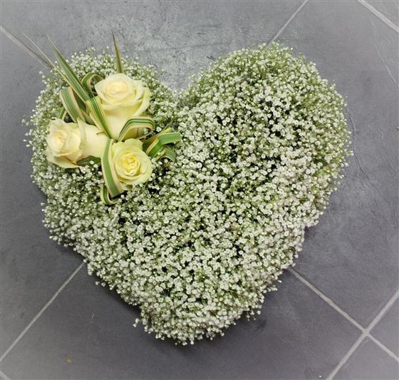 A petite heart tribute of green and white featuring delicate gypsophila and white roses.