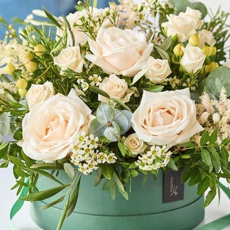 Your florist will select a colour Hatbox to co-ordinate with the neutral mix of flowers.
