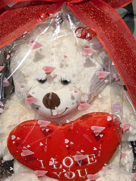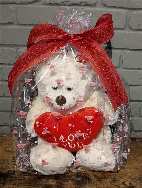 A Teddy holding an I Love You Heart, Gift Wrapped with a bow.
