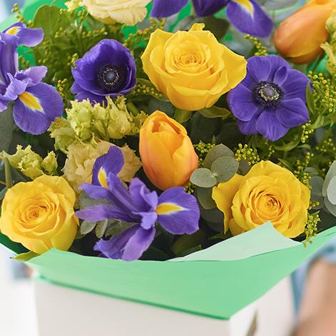 The Bouquet of the Month this month is the beautiful Rose & Iris Bouquet - a selection of fresh blooms including at least three yellow roses and three purple iris with other co-ordinating flowers, expertly handcrafted into a stunning bouquet.