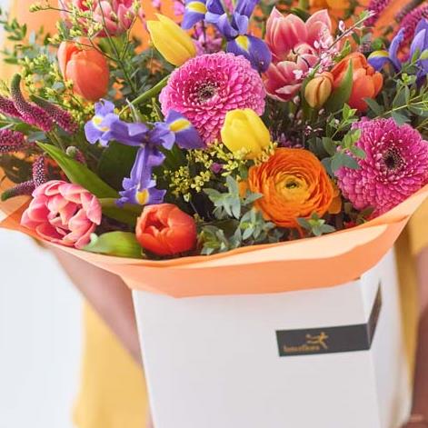 The Spring Bouquet with Tulips - A vibrant celebration of spring, plus that spring favourite – the tulip. Our florist will include at least 8 of these beauties, plus a mix of other fresh blooms in wondrously vibrant and rich shades. Think cerise, marmalade, chartreuse and ochre.