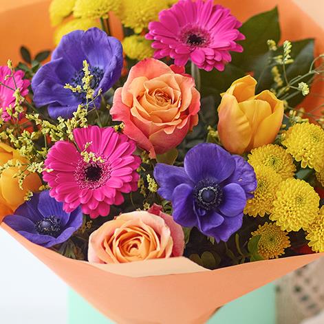 Fresh flowers and foliage in bright colours inspired by new spring growth, think sunshine yellow, tangerine orange, with pops of cerise .A great gift for: birthdays, says congratulations, sending someone spring colour