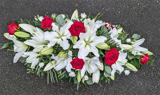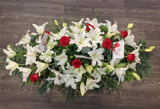 A classic spray of red roses and fragrant white oriental lilies contrasted beautifully with foliage.