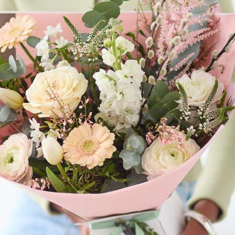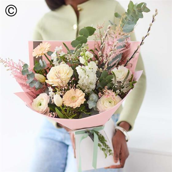 One of our larger spring bouquets, this one is a handcrafted marvel. It features the freshest blooms inspired by a soft spring dawn, all exquisitely arranged by one of our florist team. Expect shades of peach, dusky pink, lemon and cream plus dried flowers and foliage.