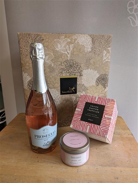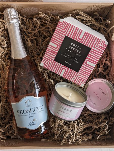 This gift set contains a 75cl bottle of Ca'di Alte Prosecco Rose, a box of Cocoa Dusted Truffles with Salted Caramel Flavour and an English Rose scented candle, delivered in a presentation gift box.