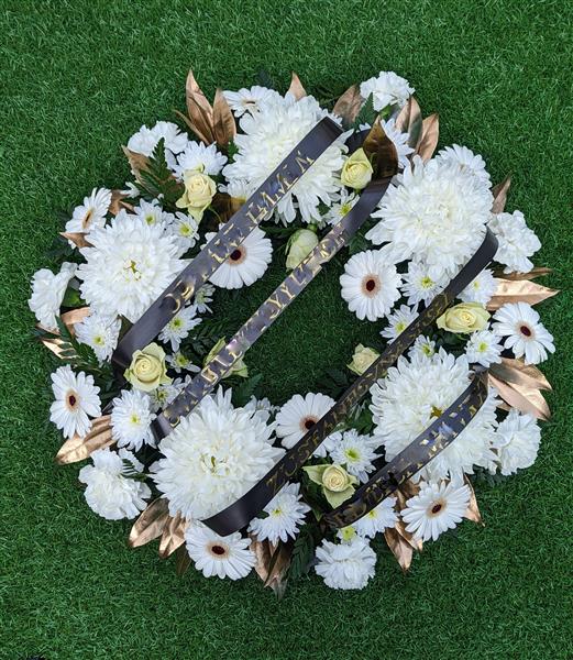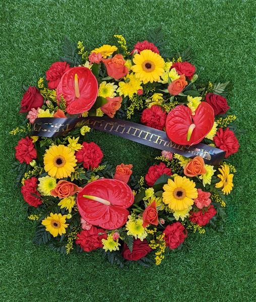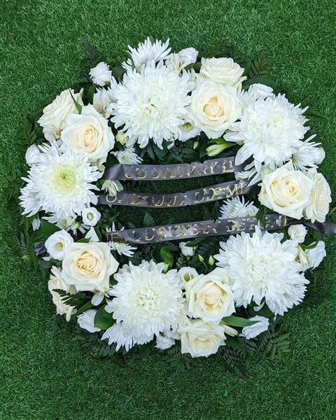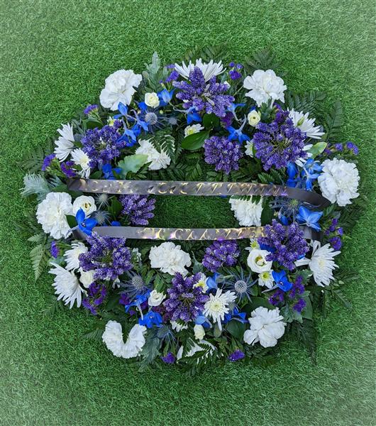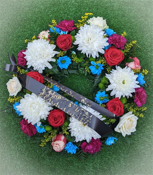As an alternative to the small message cards, we can print you message on to a ribbon sash secured across the wreath made with a beautiful mix of flowers in your chosen colour scheme.