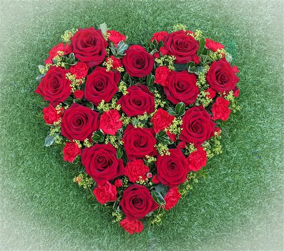 Arranged on a heart shaped base, edged with foliage or ribbon.