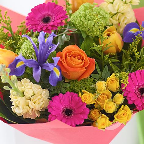 A gorgeous bouquet of vibrant fresh flowers and foliage in bright colours inspired by new spring growth, think sunshine yellow, tangerine orange, with pops of cerise.