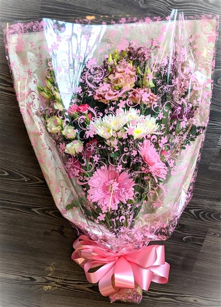 This bouquet is gift wrapped in cellophane and finished with a bow.