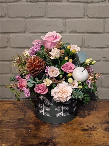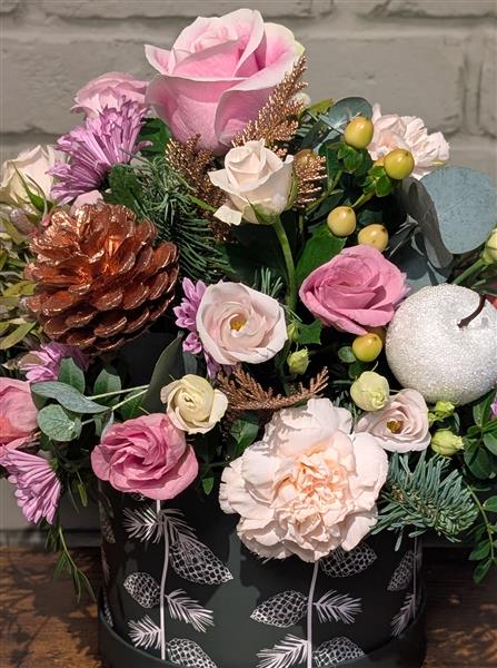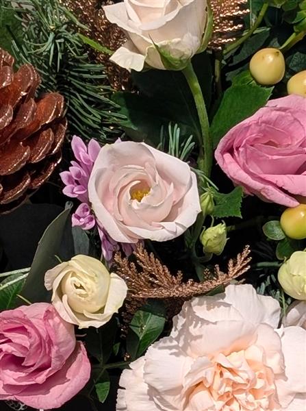 Pictured here in a Christmas Pastel Pink colour palette, we will arrange a lovely selection of flowers with Christmas foliages and accessories.