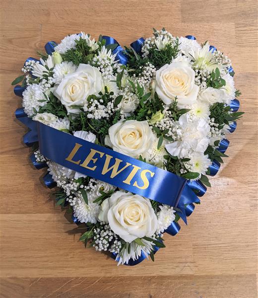 A mixture of WBA colour flowers arrangemed in heart shape, personalised with your choice of word/name