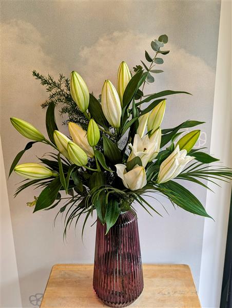 This fabulous gift really showcases the full beauty of these stunning Oriental lilies. Beautifully displayed in a glass vase to really emphasise the splendour of the flowers and play on the contrast of crisp, white petals set against rich green leaves. A contemporary, luxurious design and a beautiful way to enjoy lilies.