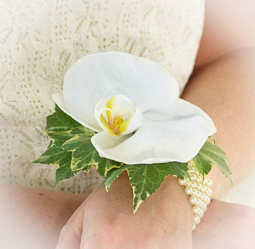 This classic Phalaenopsis Orchid wrist corsage will simply look stunning on the wrist of the wearer and is able to go with any colour outfit. The Orchid heads have been expertly combined with some complimenting foliages and attached to the pearl wrist band.